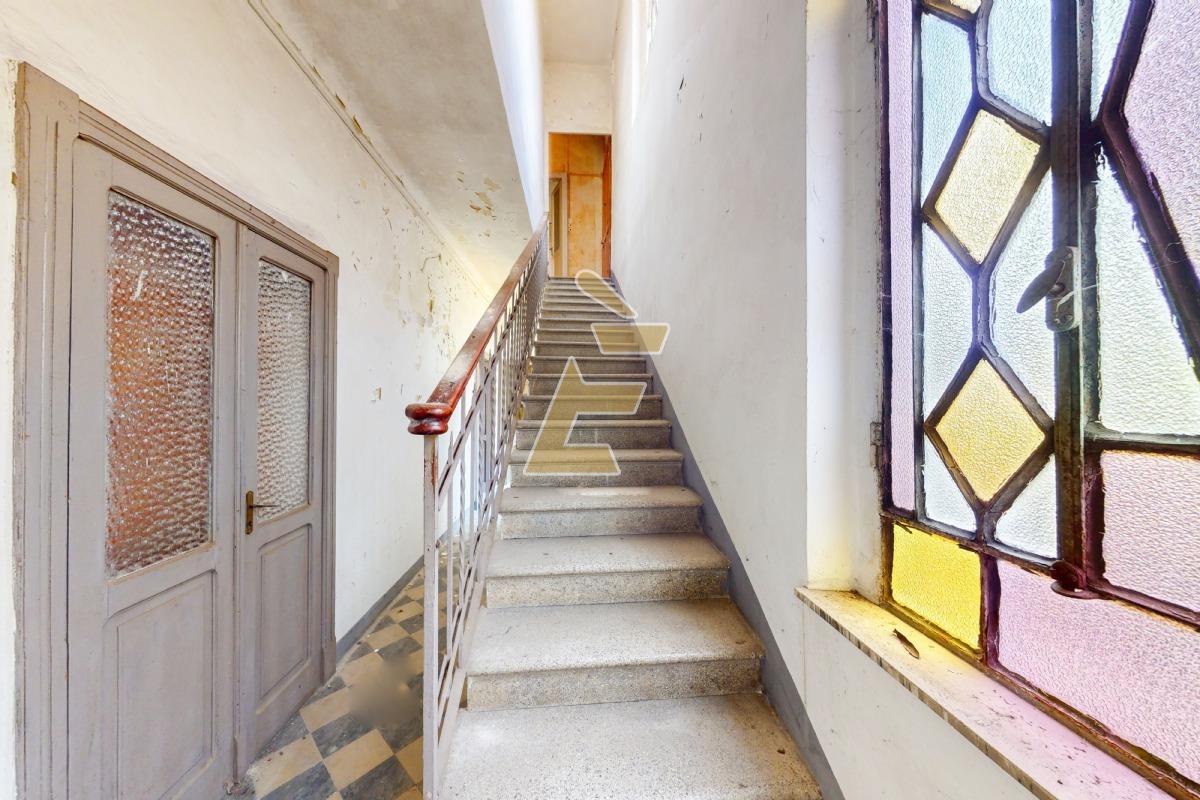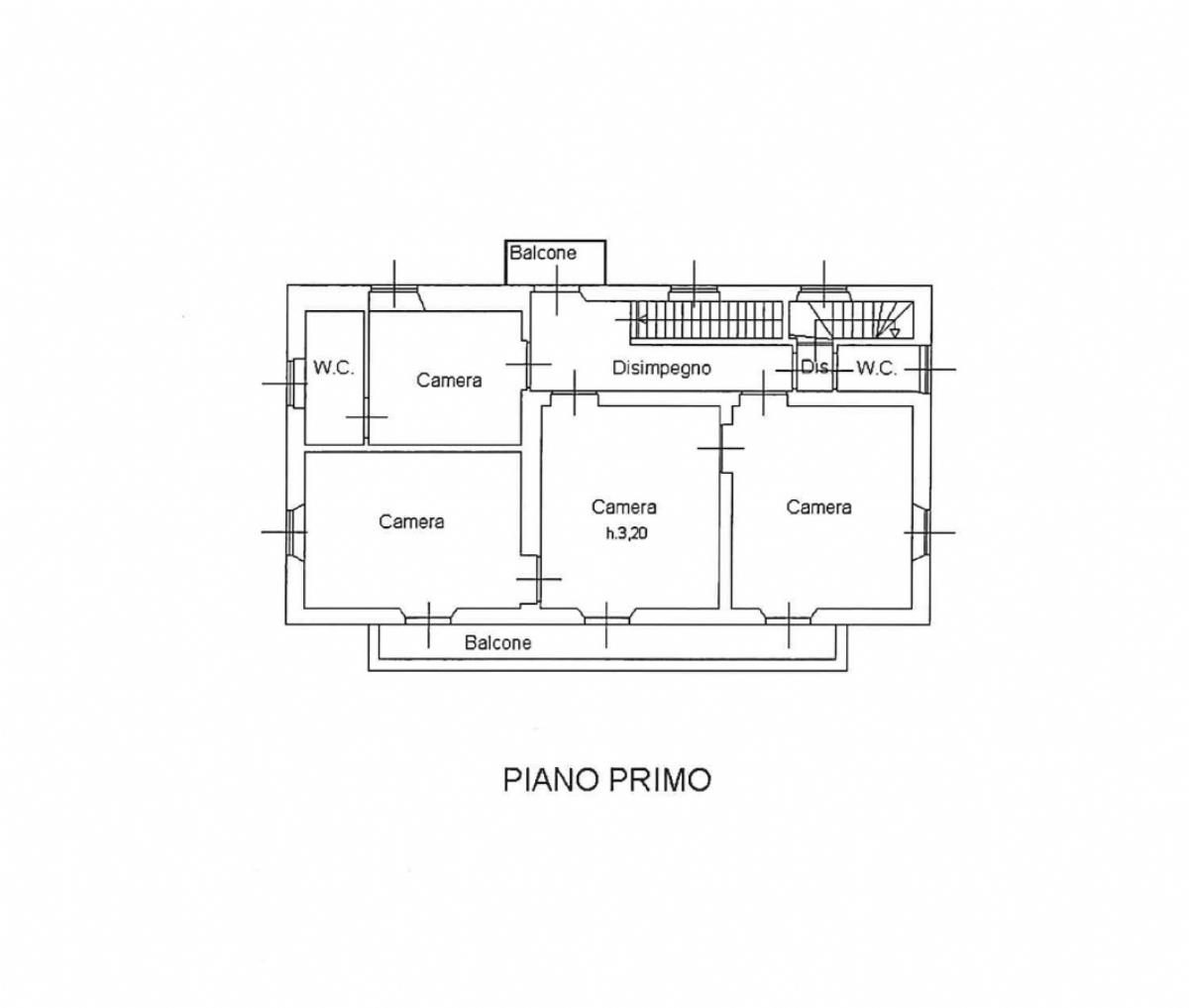 La casa, c.a. mq 318, è così disposta: ingresso al piano terra su zona giorno con cucina e sala da pranzo, soggiorno, camera con w.c. e disimpegno con ingresso secondario sul retro; da qui tramite scala interna si accede al primo piano, dove si trova la zona notte composta da quattro camere di cui tre con accesso al balcone e due bagni finestrati. Serramenti originali.