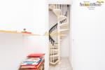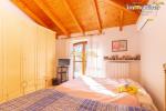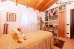La scenografica scala in legno massello conduce al primo piano, dove le travi a vista donano calore e carattere agli spazi. Qui si sviluppa la zona notte composta da tre camere da letto, un comodo ripostiglio e un bagno con accesso al terrazzo che abbraccia la villa su due lati.